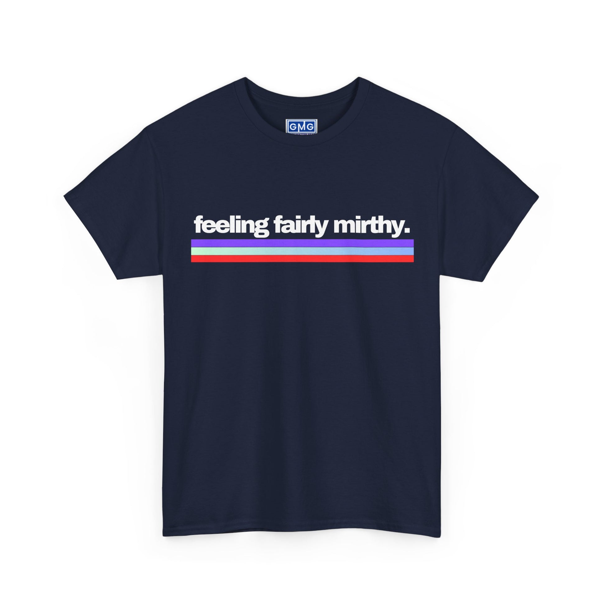 A fun, simple t-shirt for those who 'feel mirthy' about life. It offers a comfy, relaxed fit with a neat, timeless look that can blend into any occasion, casual or semi-formal. Perfect for adults looking for a sustainable and highly durable wardrobe staple.
