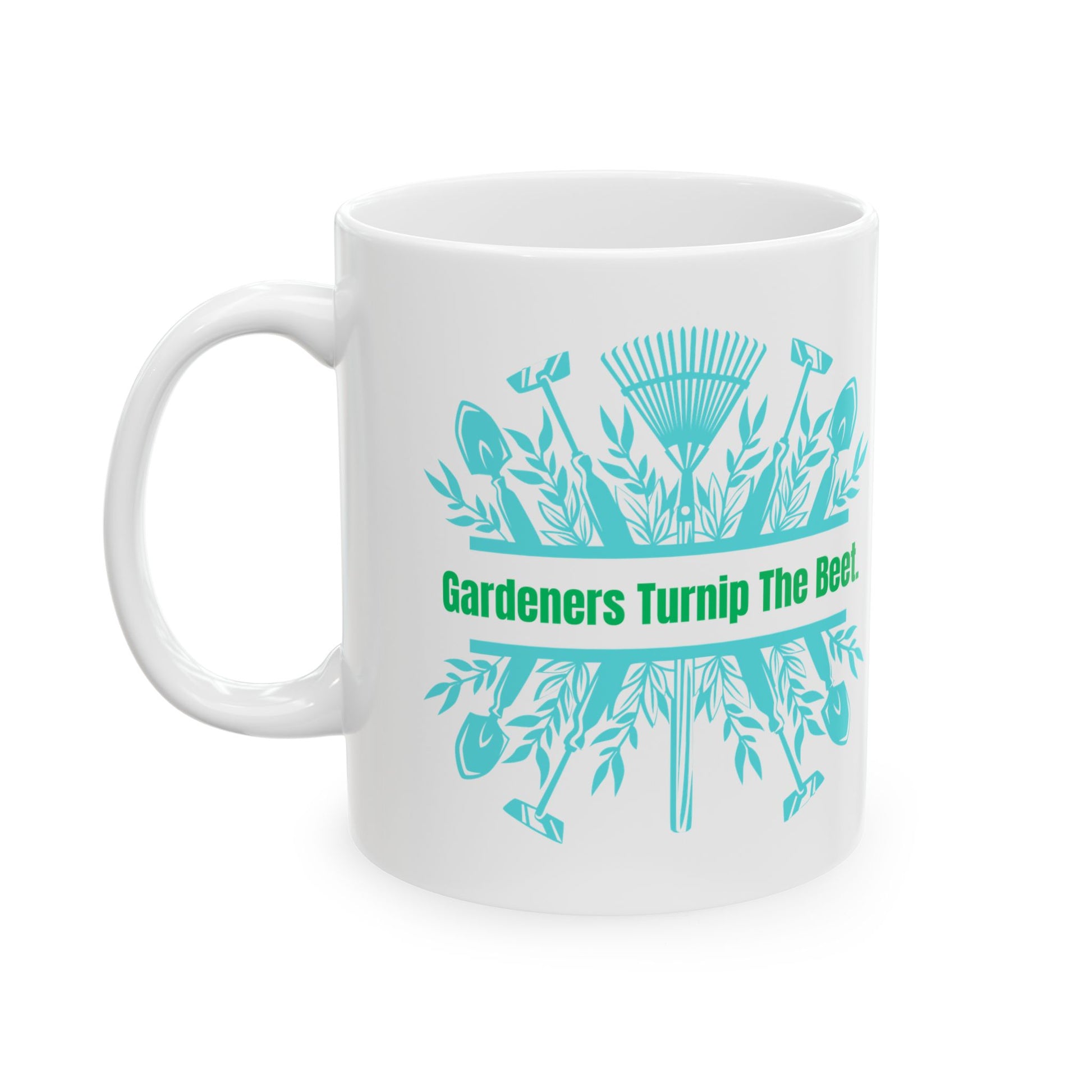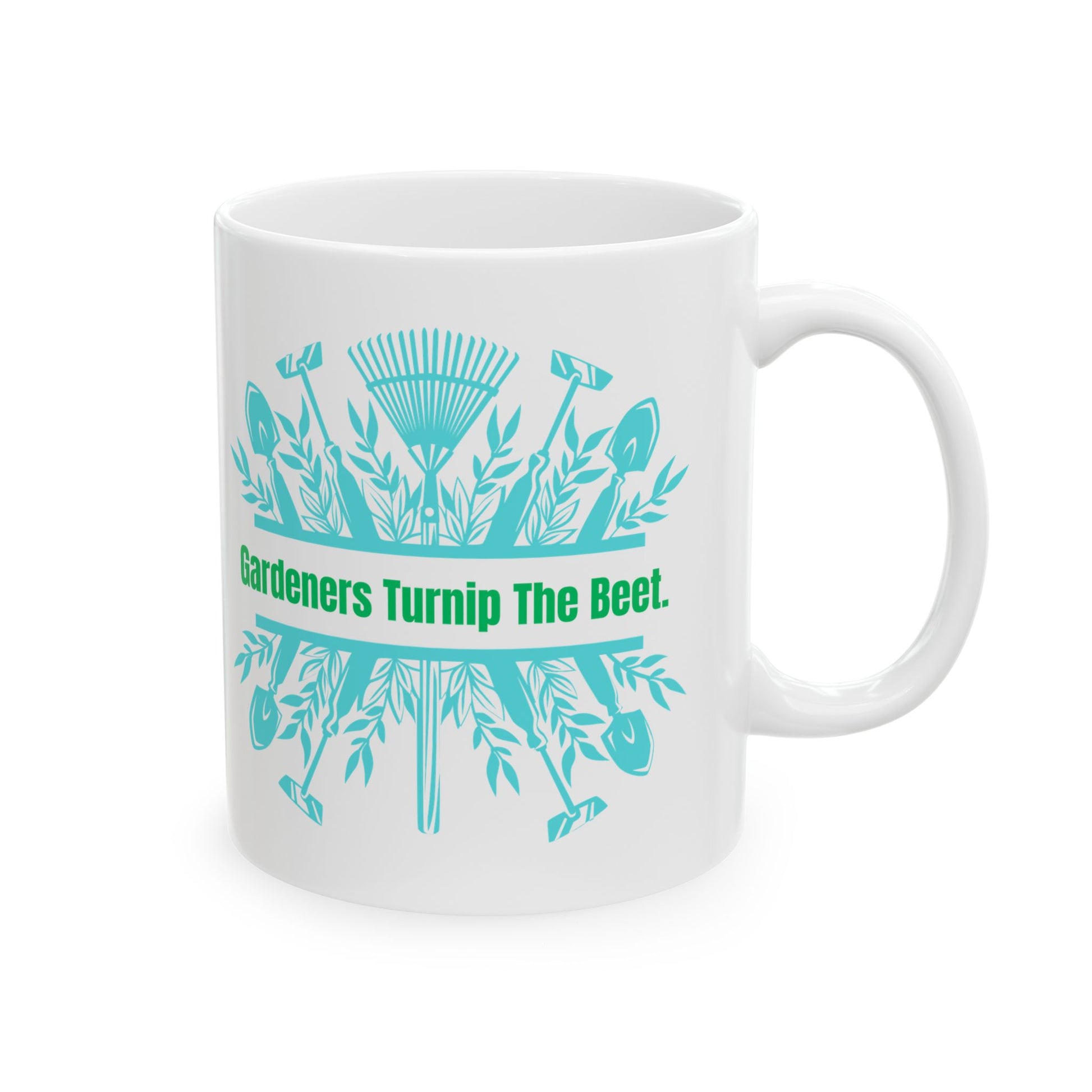 This fun "Gardeners Turnip The Beet" mug is perfect for gardeners and garden lovers. With a vibrant design and glossy ceramic finish, this mug is microwave and dishwasher safe. Available in two sizes, 11oz and 15oz, it features a comfortable C-handle and is lead and BPA-free. A great gift for gardening enthusiasts on birthdays, Mother's Day, or any special occasion.